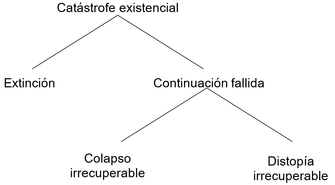 Catástrofe existencial: La destrucción del potencial a largo plazo de la humanidad (Ord, 2020). La extinción es un tipo de catástrofe existencial, pero no la única. Este diagrama del libro The Precipice (Ord, 2020) muestra los tipos de catástrofes existenciales: