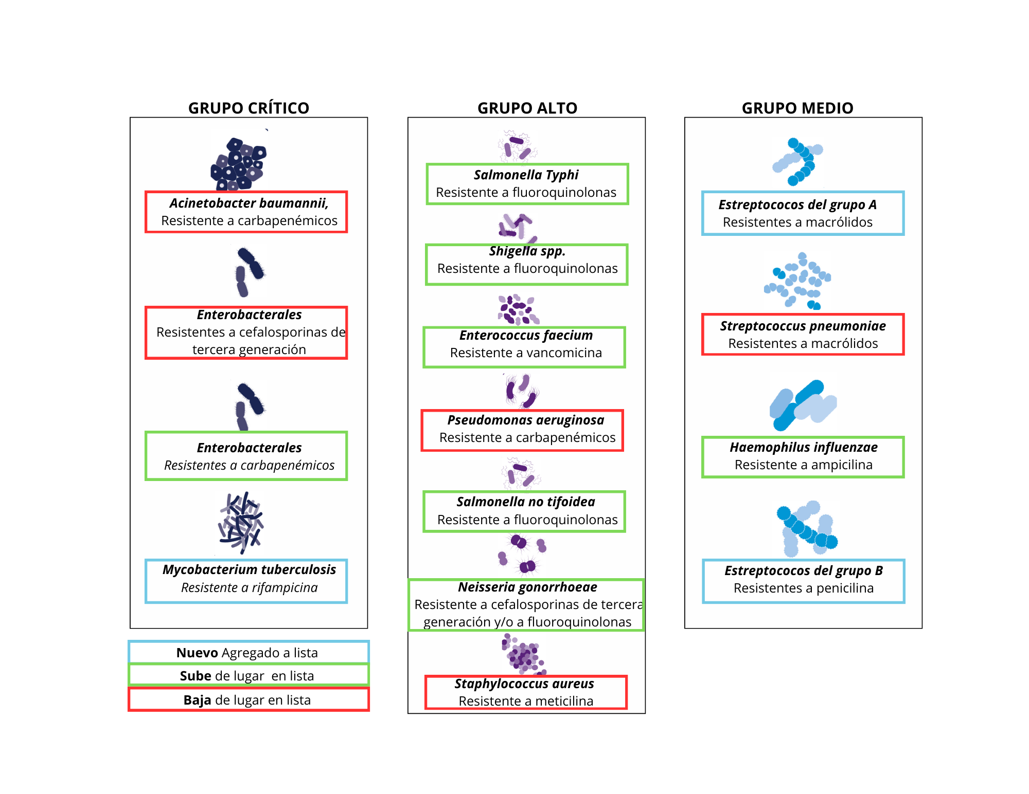 En la Figura 2, los patógenos señalados con un recuadro azul son las bacterias nuevas agregadas como prioritarias respecto a la lista de 2017, los marcados con un recuadro rojo son aquellos que han bajado de posición y los señalados con un recuadro verde son los que han subido en comparación con la lista de 2017.
