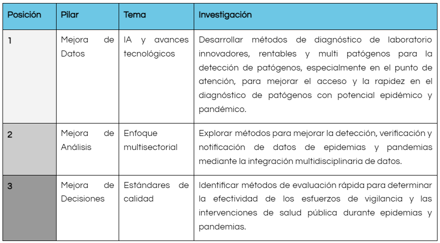 Aunque la mayoría de las prioridades se centran en "Mejores Decisiones", el primer lugar lo ocupa una investigación del pilar de "Mejora de Datos" en el subtema de "Inteligencia Artificial (IA) y Avances Tecnológicos", que propone el desarrollo de nuevos métodos de diagnóstico (Tabla 1). Esta declaración destaca la necesidad de desarrollar métodos de diagnóstico avanzados mediante el uso de nuevas tecnologías, como la inteligencia artificial, para mejorar la rapidez de los diagnósticos y guiar una respuesta mucho más efectiva.