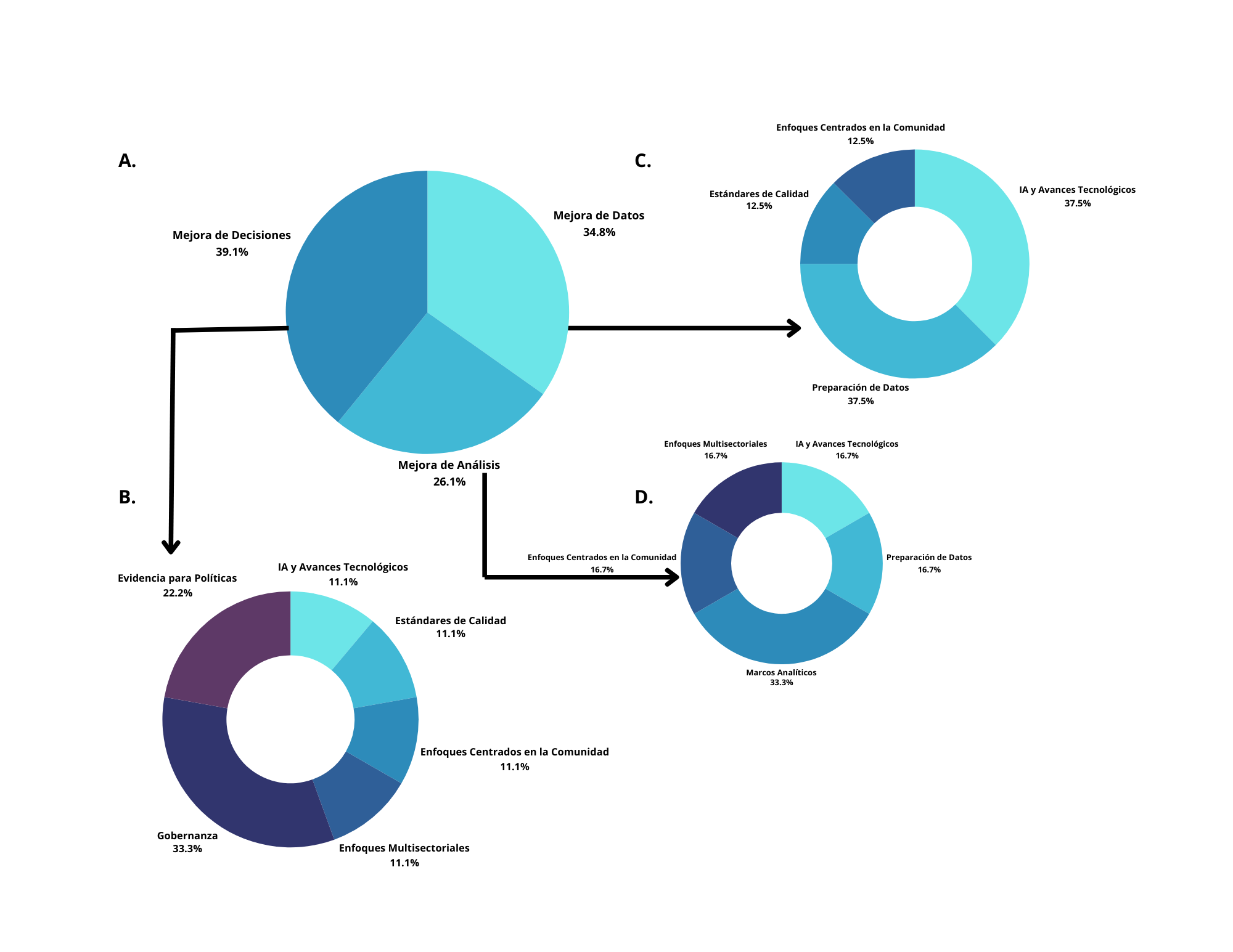 A partir de este ejercicio, los expertos a nivel global reconocieron 23 investigaciones prioritarias, clasificadas en tres pilares: Mejora de Datos, Mejora de Decisiones y Mejora de Análisis. La mayoría de las prioridades se centraron en el pilar de "Mejores Decisiones", con 9 investigaciones, mientras que en los pilares de "Mejora de Datos" y "Mejora de Análisis" se seleccionaron 8 y 6 respectivamente (Figura 1).